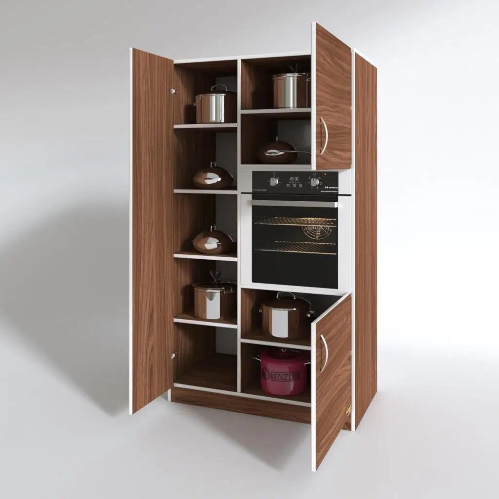 Ürünümüzün bir tarafında üst ve alt kısmında içinde rafları olan kapaklı dolaplar ve orta kısmında ankastre fırın koymak için bölmesi bulunmaktadır. Diğer tarafında 4 raflı kapaklı bir dolap bulunmaktadır.