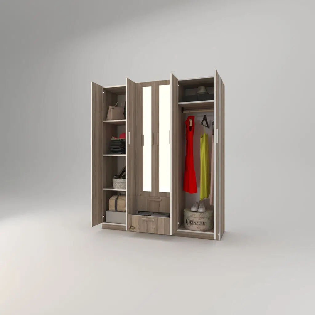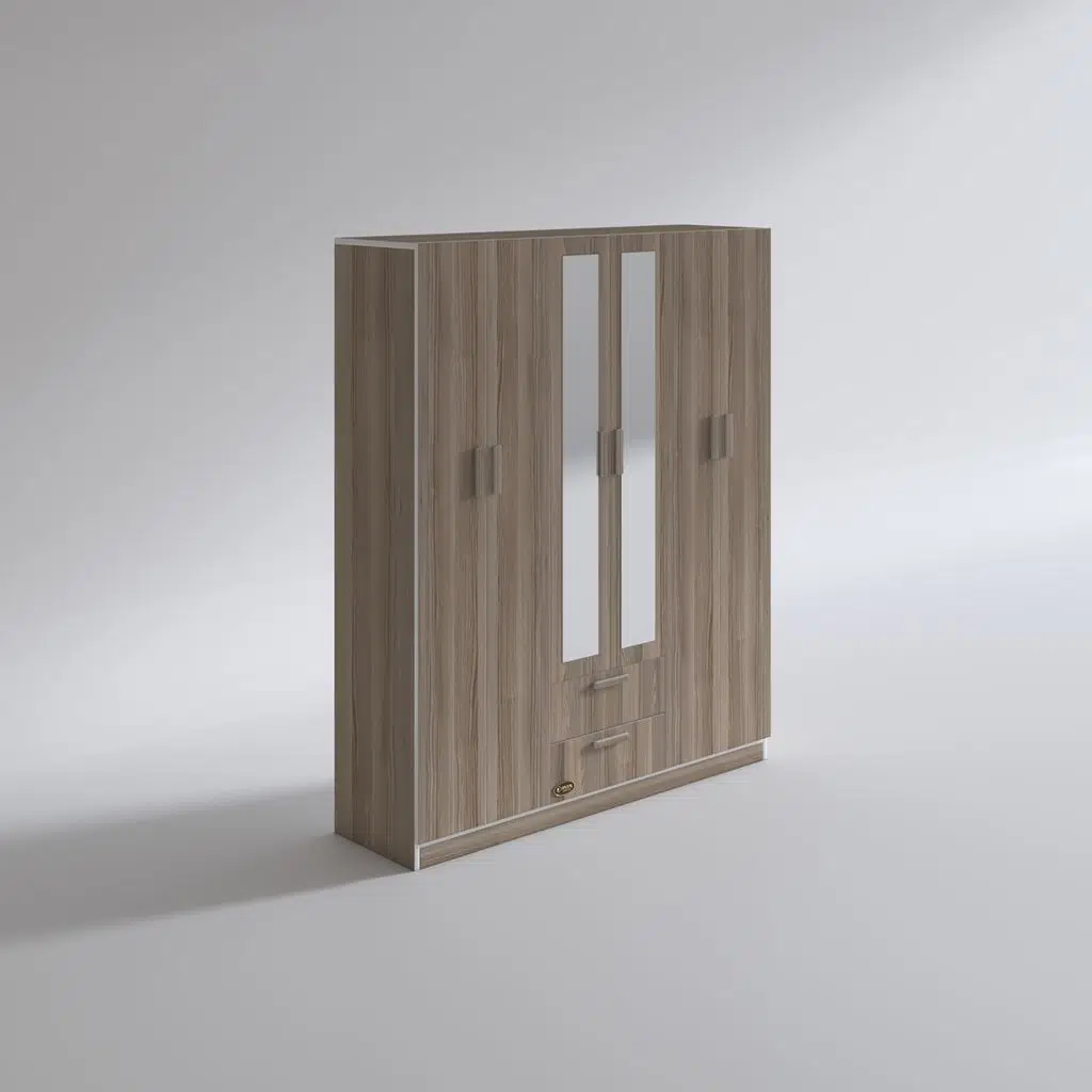 Ürünümüz 6 kapılı orta bölüm altında 2 çekmecesi olan bir gardıroptur. Sol 2 kapının olduğu bölümde 4 bölümden oluşan raflar mevcuttur. Orta bölümün altıda 2 çekmece mevcuttur. Orta bölümün üstünde elbise asmak için askılık mevcuttur. Sağ 2 kapının olduğu yerde üste tarafta yüklük hemen altında askılık mevcuttur. Ortadaki iki kapının üstünde boy aynası mevcuttur.