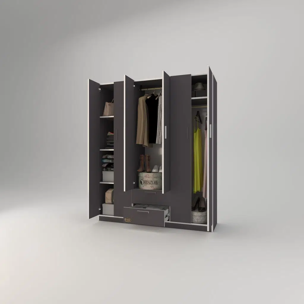 Ürünümüz 6 kapılı orta bölüm altında 2 çekmecesi olan bir gardıroptur. Sol 2 kapının olduğu bölümde 4 bölümden oluşan raflar mevcuttur. Orta bölümün altıda 2 çekmece mevcuttur. Orta bölümün üstünde elbise asmak için askılık mevcuttur. Sağ 2 kapının olduğu yerde üste tarafta yüklük hemen altında askılık mevcuttur.
