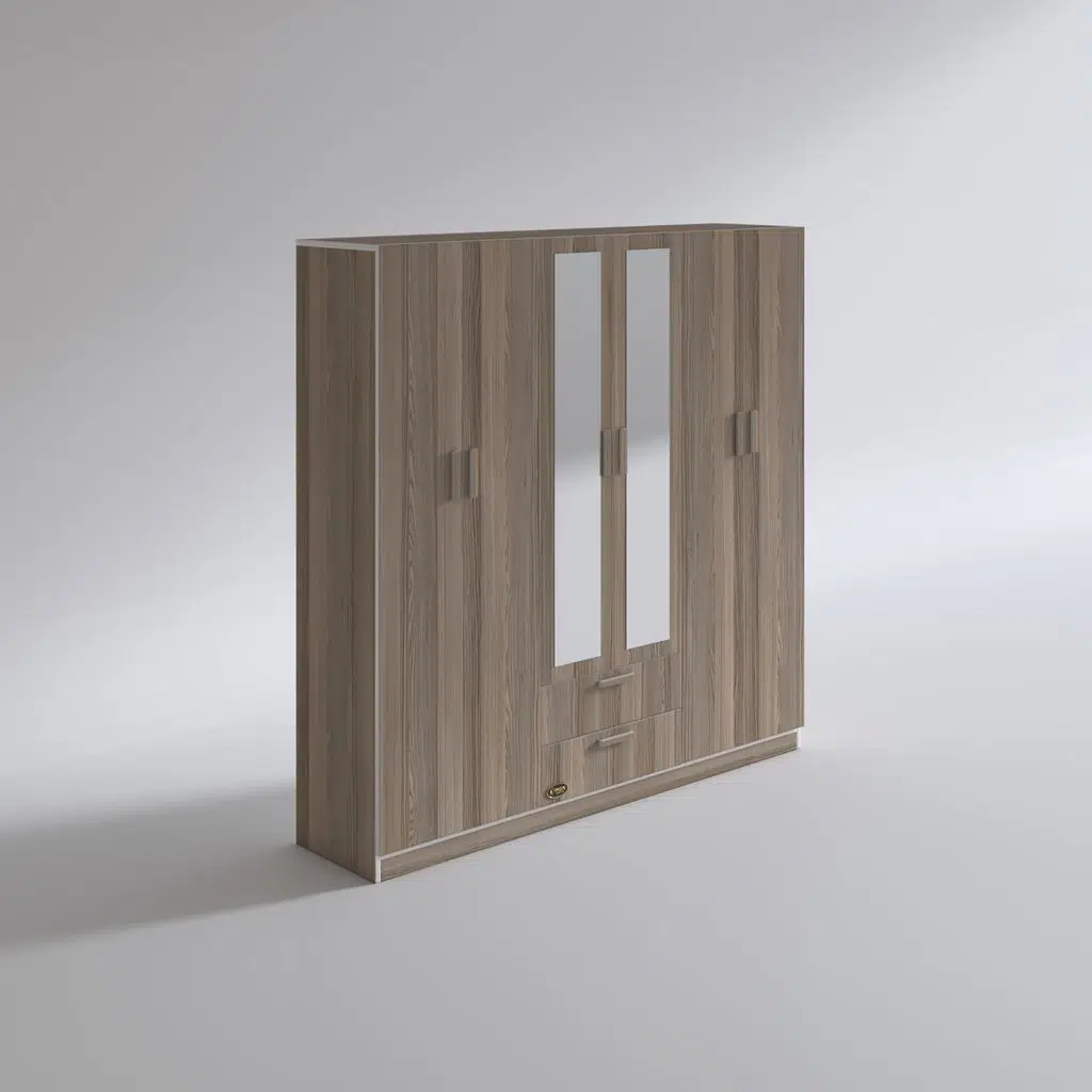 Ürünümüz 6 kapılı orta bölüm altında 2 çekmecesi olan bir gardıroptur. Sol 2 kapının olduğu bölümde 4 bölümden oluşan raflar mevcuttur. Orta bölümün altıda 2 çekmece mevcuttur. Orta bölümün üstünde elbise asmak için askılık mevcuttur. Sağ 2 kapının olduğu yerde üste tarafta yüklük hemen altında askılık mevcuttur. Ortadaki iki kapının üstünde boy aynası mevcuttur.