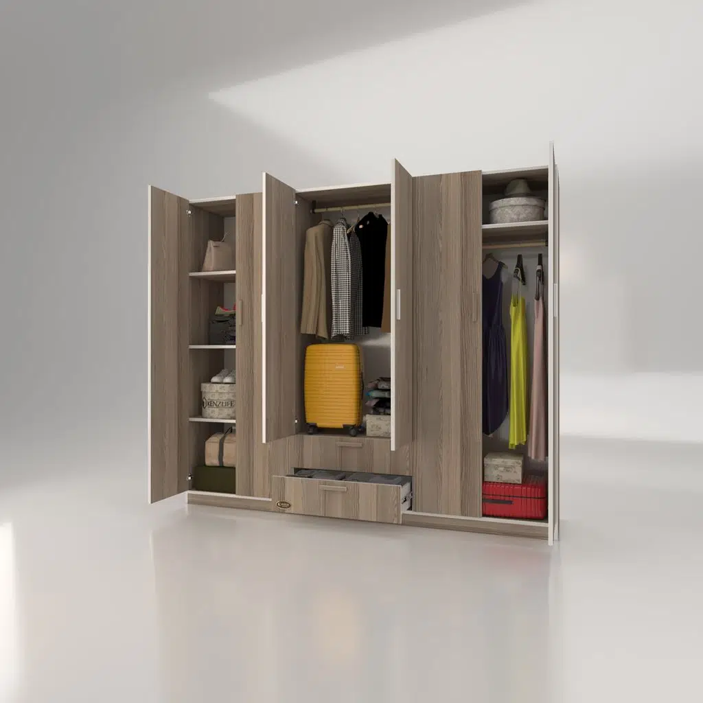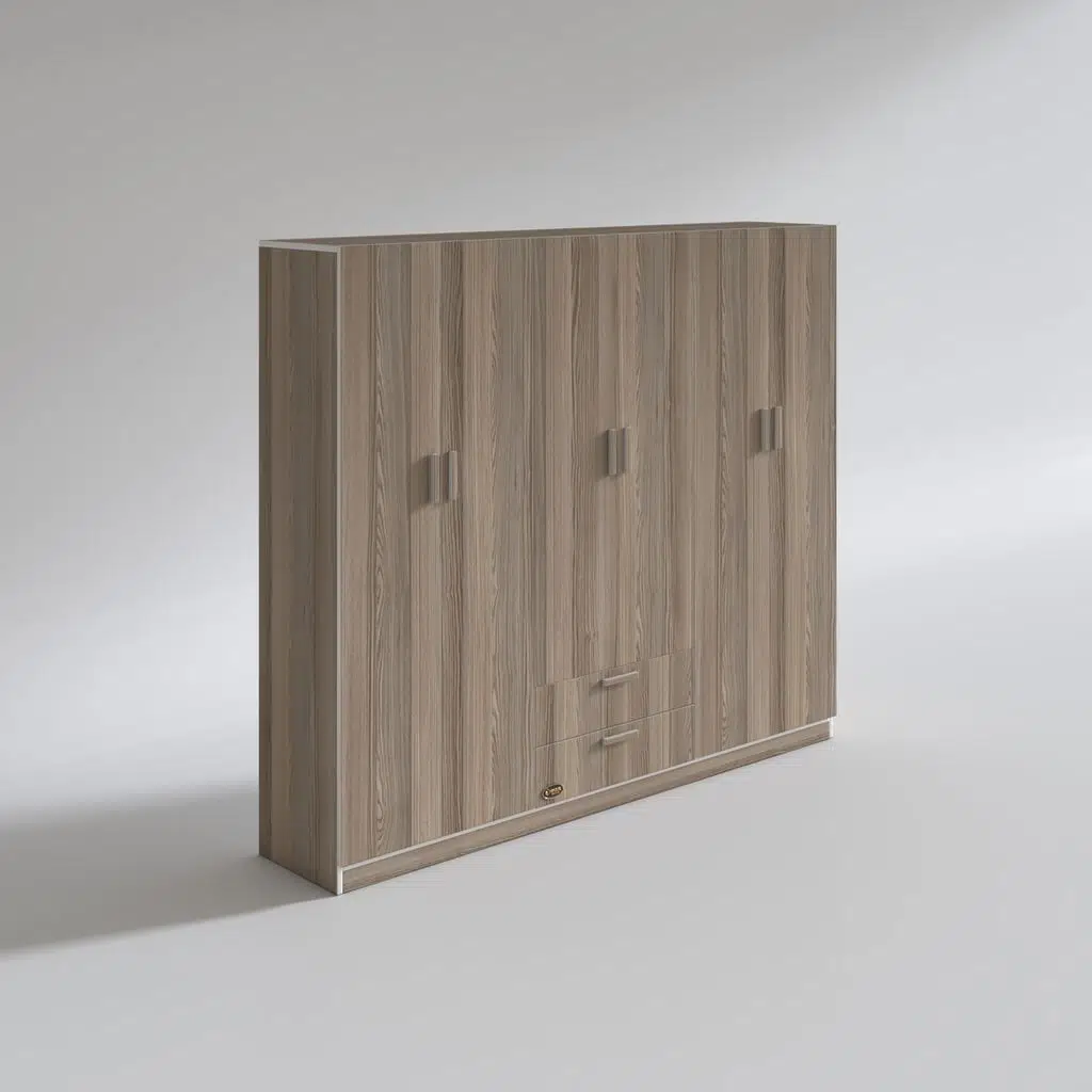 Ürünümüz 6 kapılı orta bölüm altında 2 çekmecesi olan bir gardıroptur. Sol 2 kapının olduğu bölümde 4 bölümden oluşan raflar mevcuttur. Orta bölümün altıda 2 çekmece mevcuttur. Orta bölümün üstünde elbise asmak için askılık mevcuttur. Sağ 2 kapının olduğu yerde üste tarafta yüklük hemen altında askılık mevcuttur.