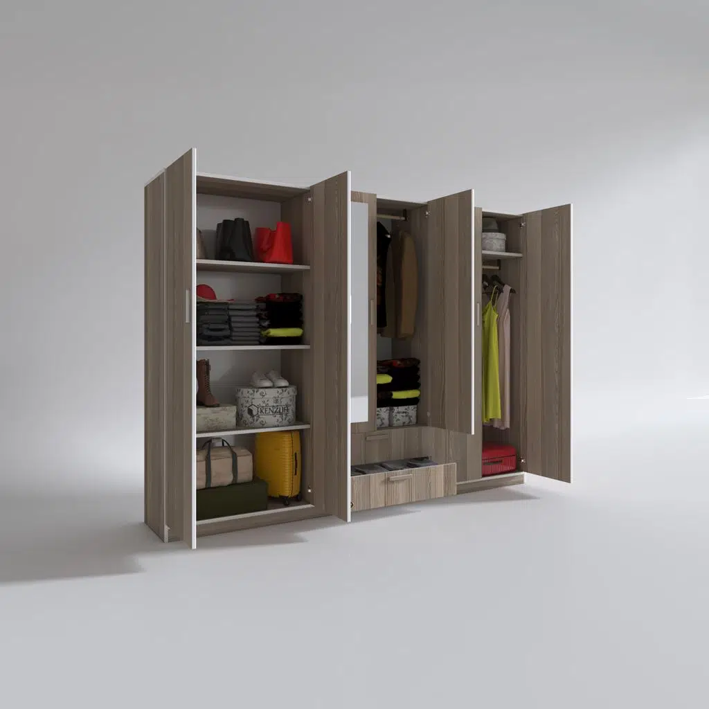 Ürünümüz 6 kapılı orta bölüm altında 2 çekmecesi olan bir gardıroptur. Sol 2 kapının olduğu bölümde 4 bölümden oluşan raflar mevcuttur. Orta bölümün altıda 2 çekmece mevcuttur. Orta bölümün üstünde elbise asmak için askılık mevcuttur. Sağ 2 kapının olduğu yerde üste tarafta yüklük hemen altında askılık mevcuttur. Ortadaki iki kapağın üstünde iki adet boy aynası mevcuttur.