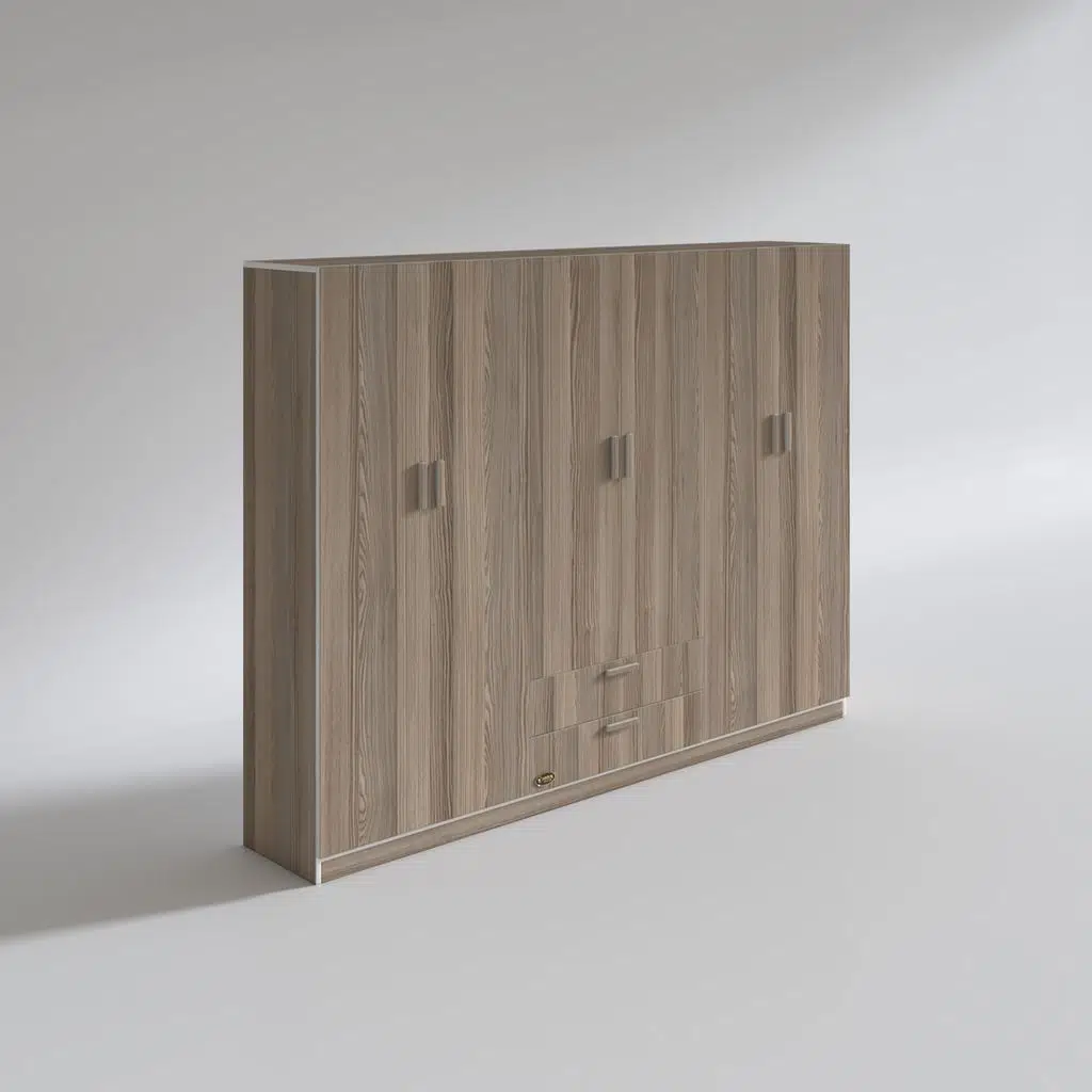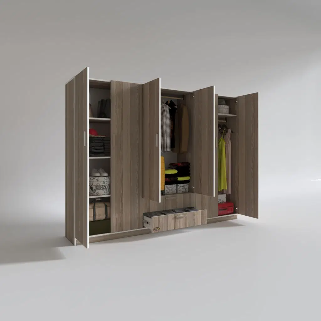 Ürünümüz 6 kapılı orta bölüm altında 2 çekmecesi olan bir gardıroptur. Sol 2 kapının olduğu bölümde 4 bölümden oluşan raflar mevcuttur. Orta bölümün altıda 2 çekmece mevcuttur. Orta bölümün üstünde elbise asmak için askılık mevcuttur. Sağ 2 kapının olduğu yerde üste tarafta yüklük hemen altında askılık mevcuttur.