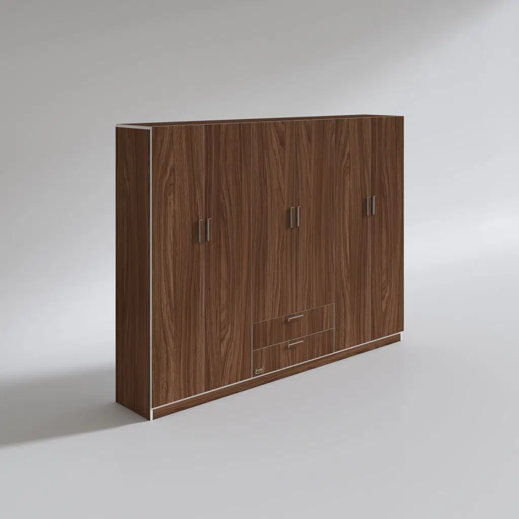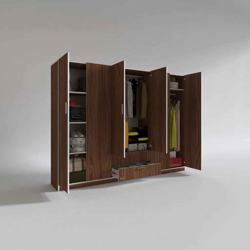 Ürünümüz 6 kapılı orta bölüm altında 2 çekmecesi olan bir gardıroptur. Sol 2 kapının olduğu bölümde 4 bölümden oluşan raflar mevcuttur. Orta bölümün altıda 2 çekmece mevcuttur. Orta bölümün üstünde elbise asmak için askılık mevcuttur. Sağ 2 kapının olduğu yerde üste tarafta yüklük hemen altında askılık mevcuttur.