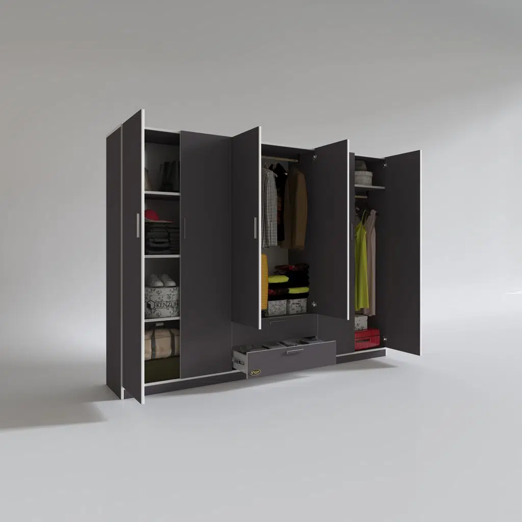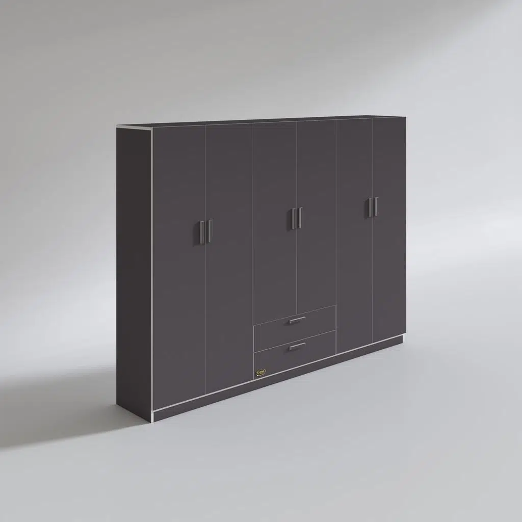 Ürünümüz 6 kapılı orta bölüm altında 2 çekmecesi olan bir gardıroptur. Sol 2 kapının olduğu bölümde 4 bölümden oluşan raflar mevcuttur. Orta bölümün altıda 2 çekmece mevcuttur. Orta bölümün üstünde elbise asmak için askılık mevcuttur. Sağ 2 kapının olduğu yerde üste tarafta yüklük hemen altında askılık mevcuttur.