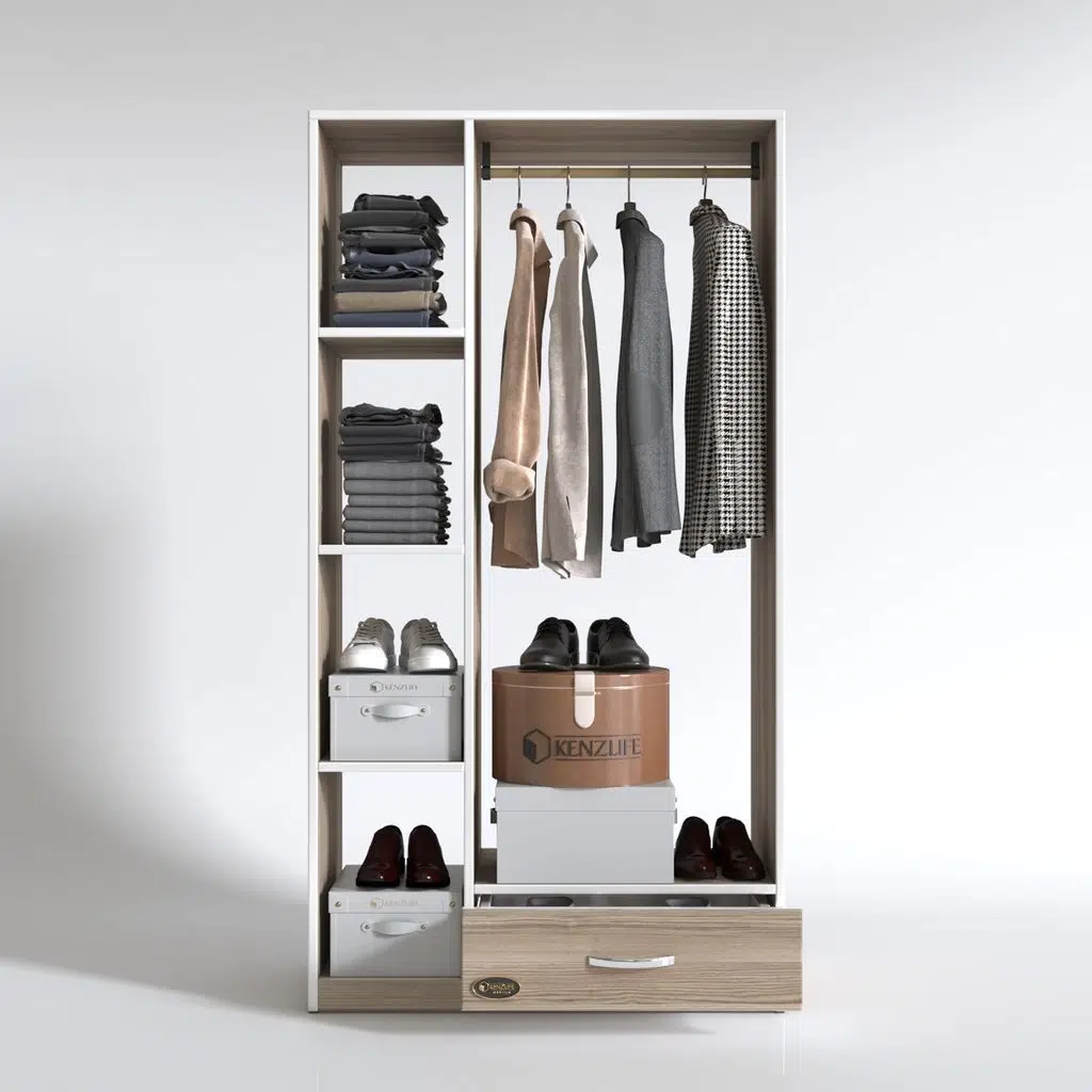 Açık ünite olarak tasarlanmıştır. Ürün, sağ tarafı askılı (askılı kısmın iç ölçüleri: Yükseklik: 143.7 cm Genişlik: 56.4 cm) ve 1 çekmeceli (Çekmece Yükseklik: 19.5 cm Genişlik: 56.4 cm), sol tarafı raflı (her birinin iç ölçüsü Yükseklik: 39 cm Genişlik: 28.2 cm) olmak üzere 2 bölümden oluşmaktadır. Ürünün arkalığı yoktur.