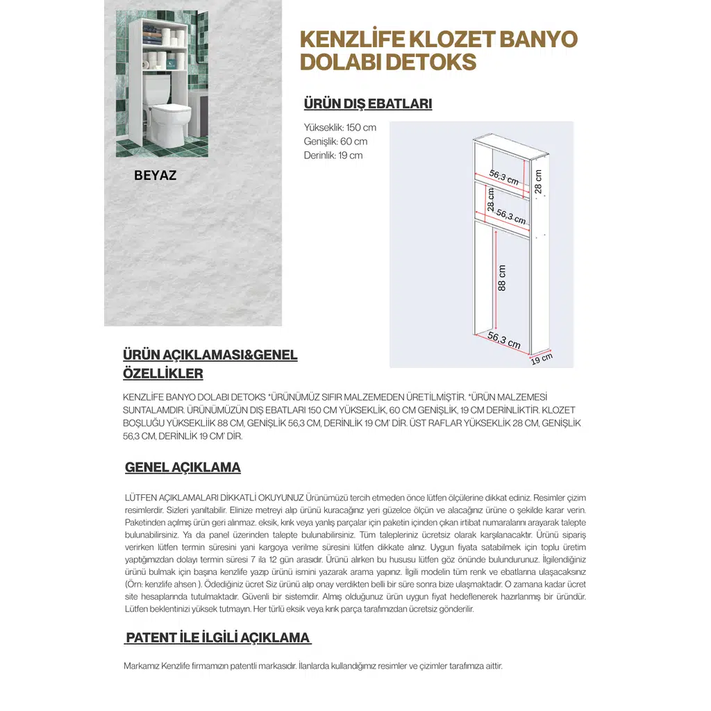 | Etiketler | Kenzlife klozet banyo dolabı detoks mat beyaz 150*060*19 arkalıksız suntalam duvara monte aparatlı |