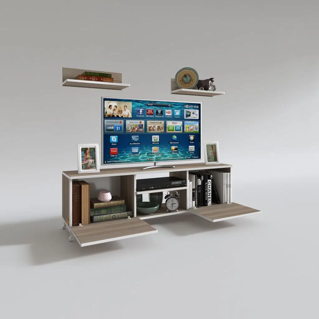 Ürünümüz üzerinde 2 adet raf olan 2 kapaklı televizyon sehpasıdır.